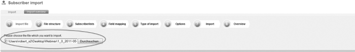 Save the file as a file with the feature 'CSV (Comma delimited)'. Apple user: If you own an apple computer, you will have to safe the file as 'CSV-Windows'. newsletteragentur does not run files in the Mac format. Step 1 – Import fileOn the navigation bar click on 'Subscribers' and then go to the navigation subitem 'Import'. This is the way how you get to the menu-guided import function of newsletteragentur. First, you will have to choose the file which you want to import; |