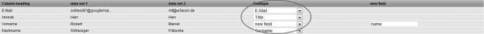 if the first line of your address file contains (as shown in the example above) the column headings, leave the item 'First line contains column headings' marked . Otherwise, if your address file starts right away with the subscriber data, unmark this option. Step 3 – Subscriber ListsChoose the subscriber list to which you want to import the addresses. Subsequently click on 'Next'. Step 4 – Field MappingNow you are asked to match the field names of your subscriber data with those of newsletteragentur. In order to do so, please choose in the drop down menus the associations which correspond to field information displayed to the left of these menus. If there does not exist a matching subscriber field, choose 'New Field' and enter a name for the subscriber field that needs to be created. Click 'Next'.