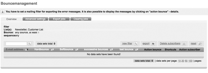 Once in an hour, you may have newsletteragentur detect bounces in one up to all subscriber lists. In order to do so, you will have to create a new 'Filter'.