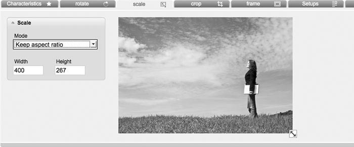 Scale: You can decide, if you want to keep or ignore aspect ratio by scaling. Now you have the possibility to scale your image by moving the small square at the right bottom with your mouse . You can also change the size manual in fields 'width' and 'height'.