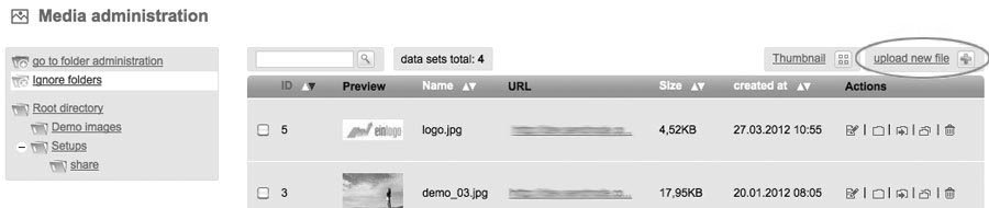 Here you can see all your uploaded files. You can chose between listview or thumbnail view.