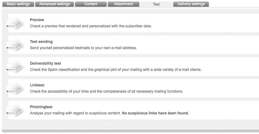 Having finished your newsletter, newsletteragentur offers you numerous testing possibilities. This helps you to optimize your mailing and achieve maximum success before actual dispatch. You can get to the testing functions by choosing the tab 'Test' in the menu in which you edit your mailing. Following tests are available: |