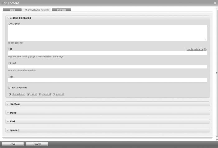 Now you have the opportunity to enter pre-adjustments for all social networks under the tab 'General Settings'. You can enter a description, a URL (exact link), a source (e.g. www.google.de) and a title of an article.