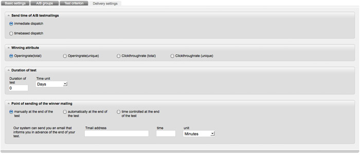 In the last tab you define the settings for the dispatch. Determine by which criterion (opening-rate or click-through-rate) newsletteragentur should identify the winner. Equally important is to determine the duration of the test.