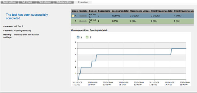 In the tab 'A/B groups' you can select the number and size of your test group. In the next tab you have to choose the 'test criterion'. Please select different subject lines, sender names, sender adresses or different sending point. Furthermore you are able to compare completely different newsletters. Of course you have to create the comparison mailing in the e-mail office at first.