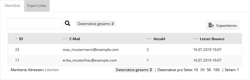 Reiter 'Überblick'Hier werden alle E-Mail-Adressen aufgelistet, deren Versendungen aufgrund von drei aufeinanderfolgenden Hardbounces zurückgehalten werden. Diese Adressen werden auf der newsletteragentur-internen 'Retained List' gesammelt. Verwaltet werden hier ausschließlich die reinen E-Mail-Adressen, unabhängig von den dazugehörenden (eventuell ehemaligen) Abonnenten. Oben rechts können Sie mit Klick auf den 'Exportieren'-Button die zurückgehaltenen E-Mail-Adressen als CSV-Datei exportieren. Die erzeugte CSV-Datei lässt sich anschließend auf dem Reiter 'Export-Jobs' herunterladen.