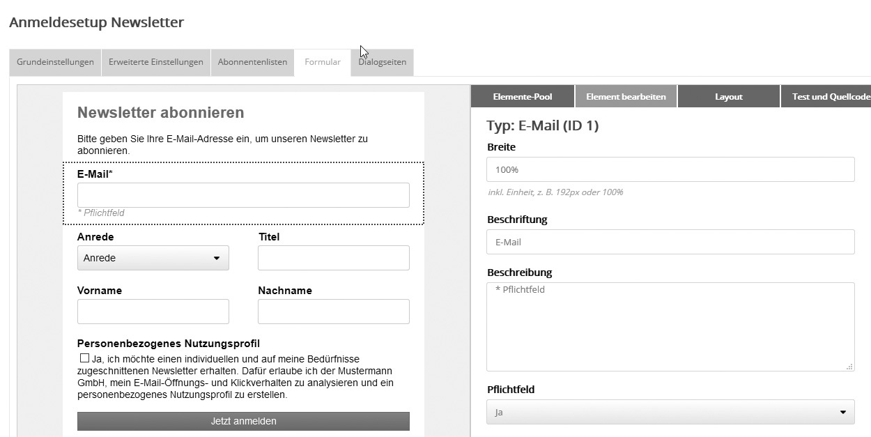 Tab #2: Elemente bearbeiten Wählen Sie links im Entwurf ein Element, dann öffnet sich rechts der Tab 'Element bearbeiten'. Der folgende Screenshot zeigt dies am Beispiel des 'E-Mail'-Feldes: