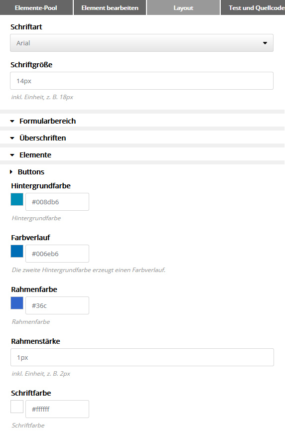 Tab #3: Layout Hier bestimmen Sie die allgemeine Optik Ihres Formulars, wie Schriftart, Farben und innere/äußere Abstände. Jede Änderung ist sofort in der Vorschau sichtbar.